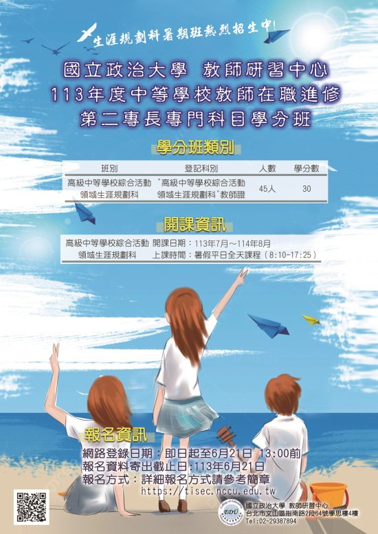 五、 | 正班及隨班附讀網路報名登錄至 113 年 6 月 21 日(星期五) 13 : 00 止,詳細資訊請參閱所附簡章內容或至該校教師研習中心網頁( http://tisec.nccu.edu.tw )查詢。聯絡電話:( 02 ) 2938-7894 。 |