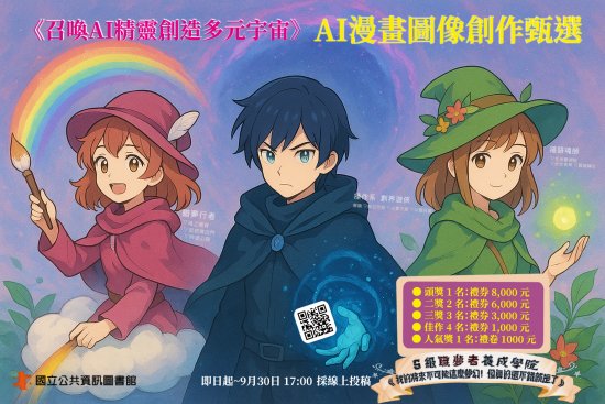 轉知國立公共資訊圖書館辦理「召喚AI精靈創造多元宇宙──AI漫畫圖像創作甄選」活動,鼓勵同學參加
